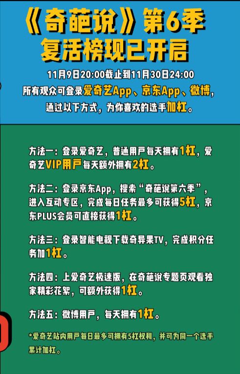 和上季奇葩说不同的地方在于,这季奇葩说新增了一个选手复活榜。观众可以通过爱奇艺 APP 、京东 APP 、微博来加杠(投票),观众加杠最高的选手即可复活。