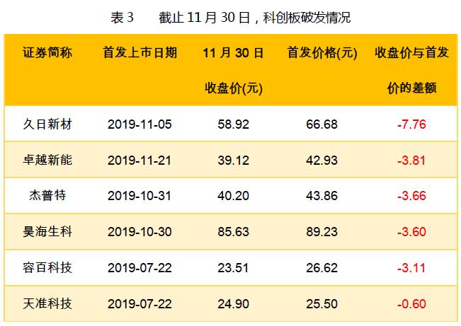 截止11月30日,科创板共有6家上市公司破发。科创板首次破发是在11月6日,两家上市公司先后跌破了发行价,一家是上市刚6个交易日的昊海生科,也是科创板首只破发个股;另一家则是上市仅两个交易日的久日新材,为目前破发最快的科创板公司。此后几日,容百科技、杰普特以及天准科技也相继破发,这三家公司均为首批上市的25家公司之中。