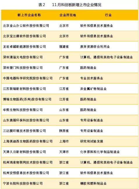 截止11月30日,科创板共上市56家,11月新增16家。11月科创板新增上市企业最多的地区为广东省和浙江省,两个省份各有3家企业;同时软件和信息技术服务业、医药制造业的新增科创板上市企业最多,两个行业各有3家企业。