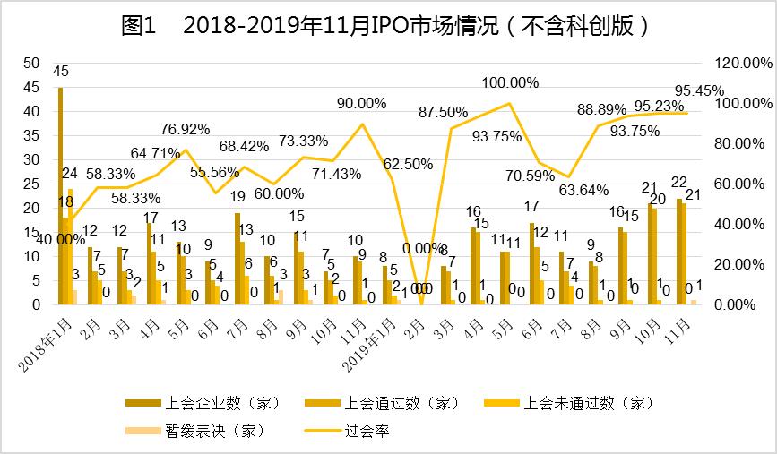 2019年11月共有22家企业上会(科创板除外),上会数达到今年历史新高,审核节奏继续维持高位。22家企业中有21家通过,过会率为95.45%。综合18年至今的IPO市场情况,2019年11月审核节奏进一步提升,过会率处于高位。