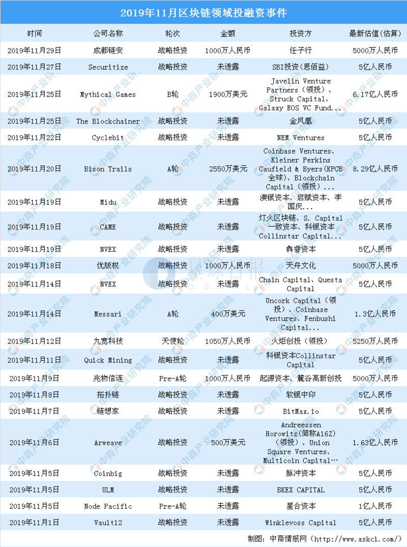 2019年11月区块链投融资事件22起,较上月减少8起