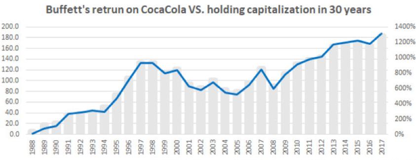 1988年,巴菲特重仓买入可口可乐5亿美元,并在1989年和1994年分别增持4亿和3亿美元,累计投资达13亿美元。今天,当初的13亿美元已经增值至超过200亿美元,而巴菲特持有可口可乐的时间已经超过30年。