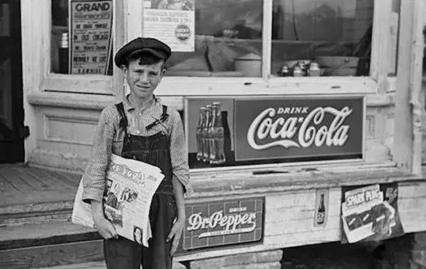 大萧条期间的报童照片,尽管经济陷入史上最严重的衰退,但可口可乐的广告仍然随处可见。这种售价仅5美分的饮料可以给人快乐的感觉,因此尽管美国人普遍囊中羞涩,但仍然愿意花点小钱购买“快乐”。可口可乐也趁此,在大萧条期间逆流而上。