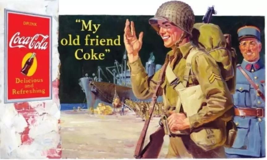 大战期间,可口可乐作为军需品跟着美国军队来到世界各地,喝着可口可乐的美国士兵成了一副天然的宣传画,而可乐也跟跟牛仔裤一起,成为美国文化的精神象征。可口可乐公司也借此良机,将它和美国精神联系在一起,让欧洲和世界重新认识了这种美国饮料。