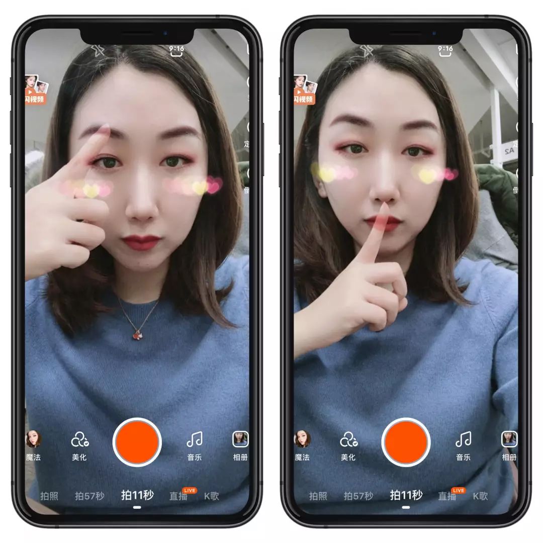 我们发现快手已经注意到了这个影响用户体验的细节,并且正在优化它。我们首先用 iPhone 7 Plus 试了一下,在视频拍摄选择美妆后时,不仅口红涂得均匀和自然,当用手挡住嘴巴、眉毛、眼睛时,脸部已经不会出现「妆容悬浮」的情况,也看不出中间有任何画面断层。