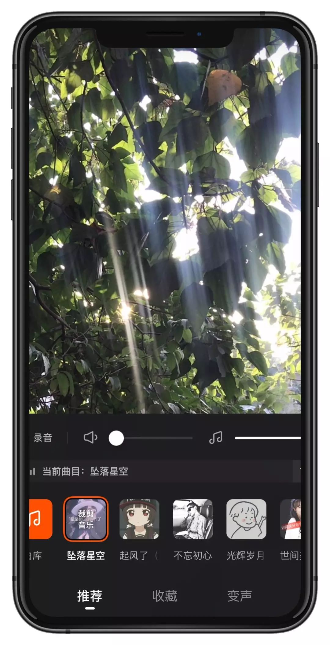 如果你想自己选的话,也可以在拍摄前和拍摄后从曲库选择相应的配乐,还能调节视频原声的音量和音乐的音量,甚至可以重新自己再录一段音频配上去。