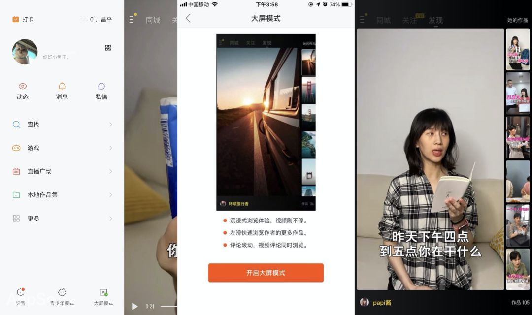 不过对于喜欢一个又一个洗脑式刷视频的用户来说,现在快手也有了一个新选项:大屏模式。在左侧边栏里开启大屏模式后,就能够上下滑浏览视频。