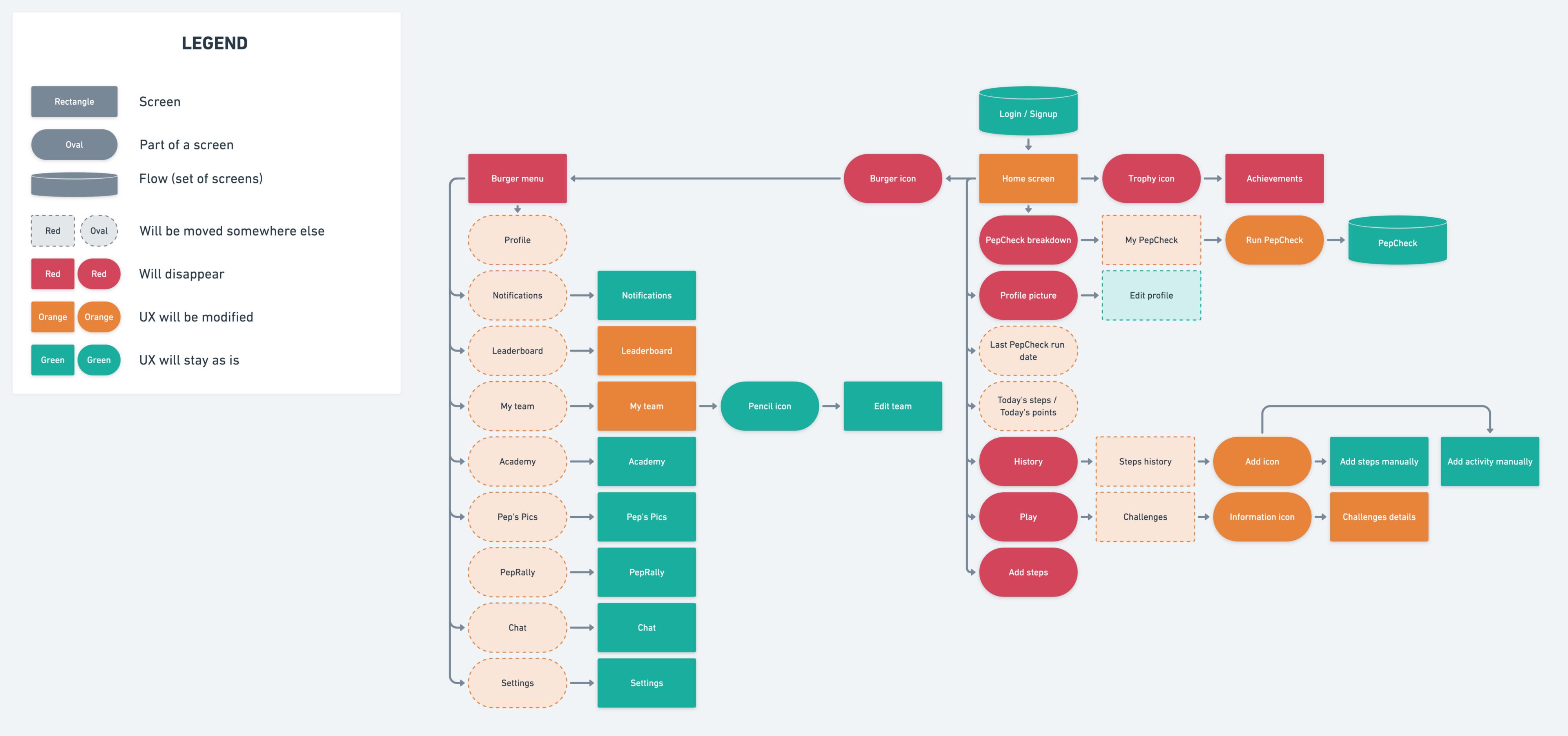 运用颜色代码也很有帮助。在上面的示例当中,我用了3种颜色以及实线和虚线来解释怎么通过我们正在做的应用的UX改进来更新当前的信息体系结构。(绿色:保持不变,橙色:会被更新,红色:会被删除;实线:会留在原来位置,虚线:会移至其他位置)。这样以来,工程师就可以清楚地看到应用的哪个部分可能要变更。