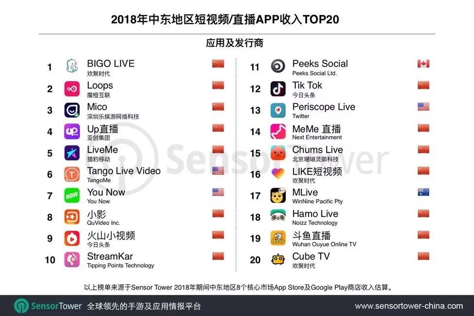 据 Sensor Tower 数据,在2018年中东地区短视频/直播 APP 收入 TOP 20 榜单中,来自中国的 APP 占据15席,BIGO LIVE 与 MICO 分列第一位和第三位。