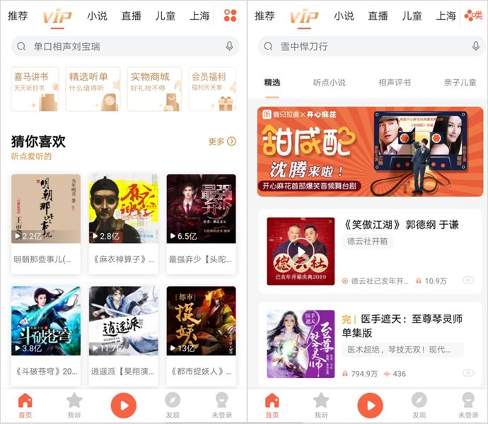而处于下级的「喜马拉雅」,则通过听书、相声、亲子儿童等轻松消遣内容,实现了泛娱乐化,彻底下沉迎合普通用户的喜好。