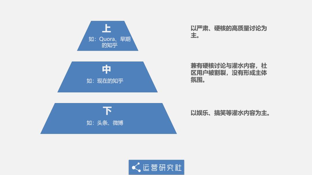 如果以内容硬核程度为衡量标准,我们可以从高到低将社区分成上、中、下三个等级。(注:上中下只以内容种类来分,与产品本身无关)