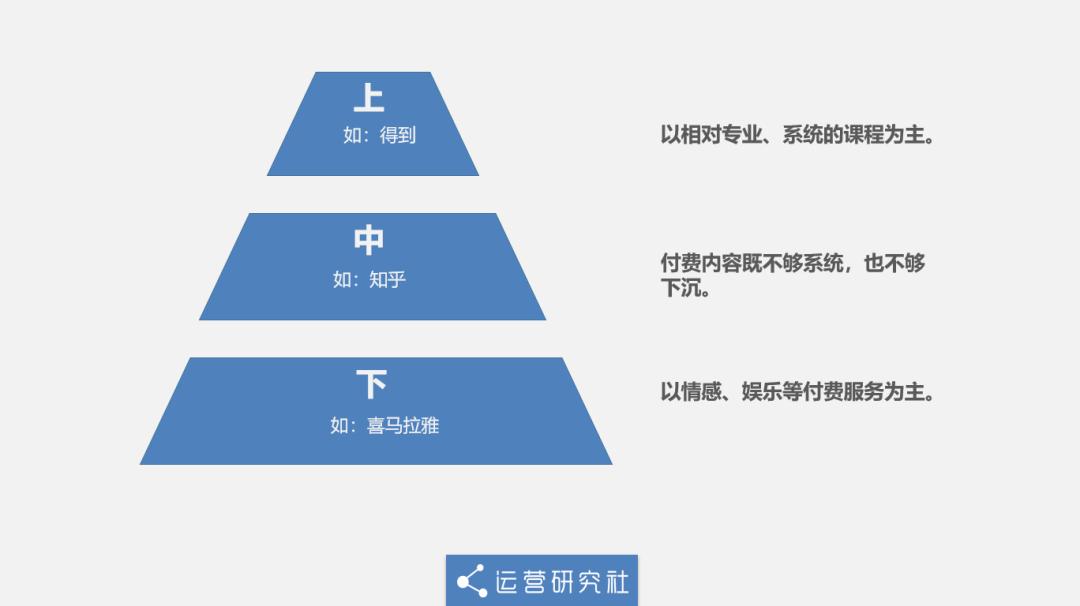 按照付费内容的硬核程度来分类,同样可以将知识付费企业分为上、中、下三个等级。(注:上中下只以内容种类来分,与产品本身无关)