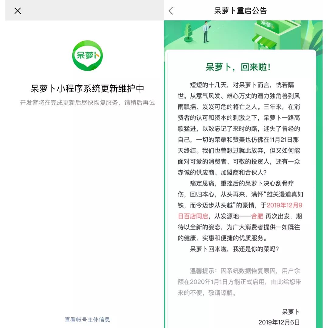左:呆萝卜小程序;右:呆萝卜重启公告