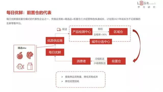 前置仓模式是由每日优鲜开创的一种新型运营模式,是将大店2000-3000个sku搬到社区门口100-300平的仓库里,成为社区里 “小而美”,当消费者线上下单,采用就近配送的形式达到“30分钟送货上门”的即时需求,也能满足菜品的多样性。