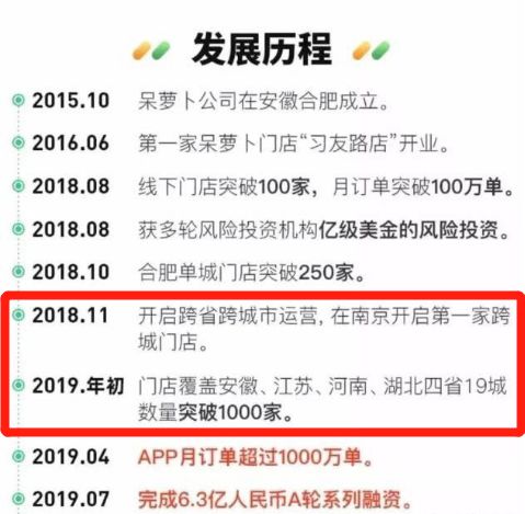 呆萝卜自获得首轮融资之后,为了能够覆盖更多社区,便开始以十倍的速度扩张。2018年11月,呆萝卜在南京开启第一家跨城门店,而在2019年初,这个数字快速扩大到了1000家。这意味着在不到半年的时间里,呆萝卜平均每天开设4家新的门店。