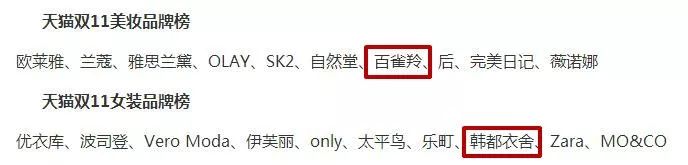 当大批传统线下品牌开始强势涌入天猫,阿里巴巴的流量资源难免向大品牌倾斜。在今年双十一销售榜单中,排在淘品牌和老字号之前的,多为欧美大牌。2019年天猫双十一美妆品牌销售排行榜中,百雀羚排名第7,女装品牌销售排行榜中,韩都衣舍则位列第8。此前,它们都曾经当过榜首。