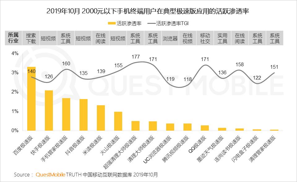 这背后,巨头纷纷加入,成为头部应用标配,视频类、短视频类、社交类、新闻资讯类头部玩家都已经入局,比如,抖音极速版用户达到了1390万。本质来说,极速版是为了下沉用户(更适应低配手机,低龄及老年用户,上手更简单、用户教育成本更低),确实也以三四五线城市为主(占比接近60%,略高于普通版本),不过问题也出来了,目前极速版与主APP之间重叠度过高、商业化协同成问题,这反而与“给主APP引流”的目标相悖。