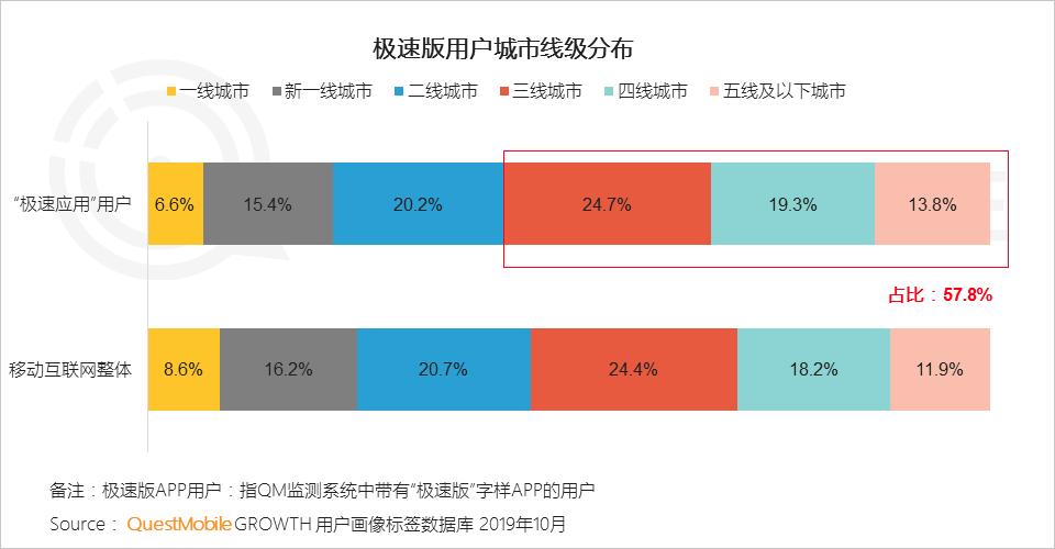 1.1 极速版应用多配置了“现金激励”措施,以助力互联网玩家抢夺下沉市场流量,极速版三四线城市用户占比明显高于移动网民整体