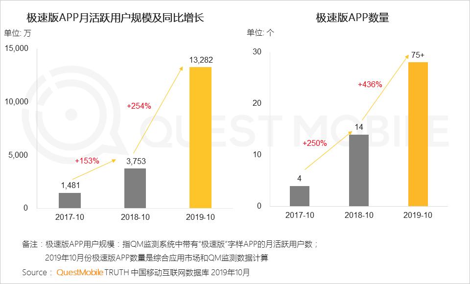 QuestMobile数据显示,截止到2019年10月,各类极速版APP月活用户已经突破1.3亿,相比去年,增速超2.5倍,同时,极速类APP数量也突破75个。