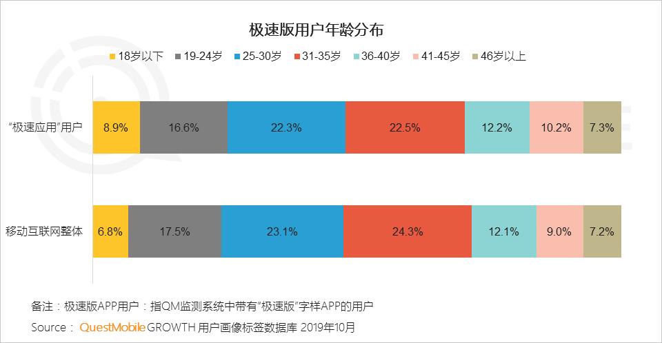 2.1 极速版应用助力互联网玩家扩大两极用户占比,极速版应用中的18岁以下的年轻用户和36岁以上的中老年用户占比较整体互联网用户大