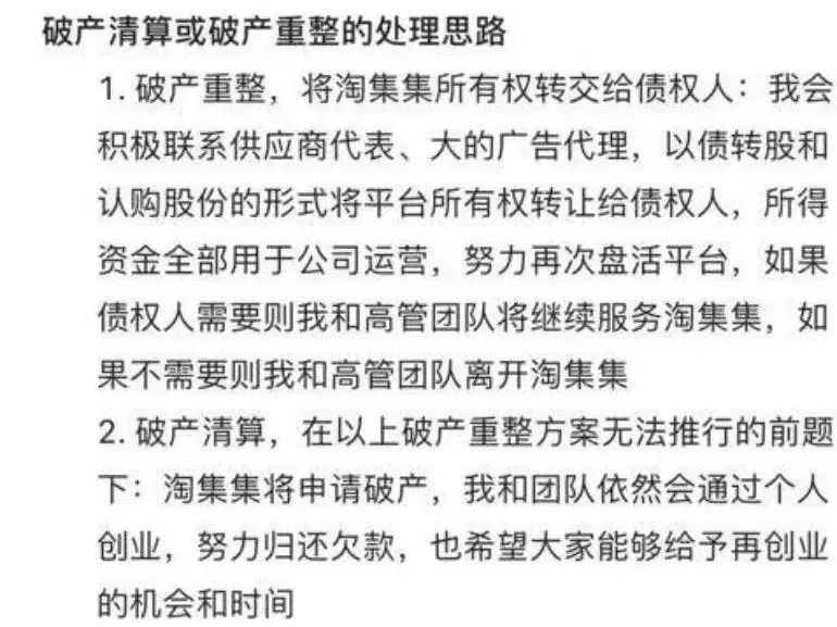 破产重整。将淘集集所有权转交给债权人,以债转股和认购股份的形式将平台所有权转让给债权人,所得资金全部用于公司运营,努力再次盘活平台。