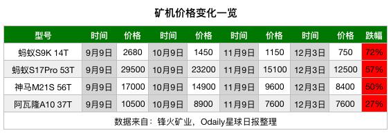 如下统计,自 9 月初到 12 月初,各家矿机厂商的大算力矿机价格出现了 27%-57% 的跳水。