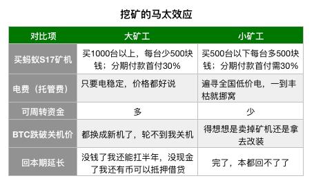 在大玩家蜂拥入场时,除去新人笑,还能闻见旧人哭。从配置矿机到找电,不同规模的矿工差距持续拉大。