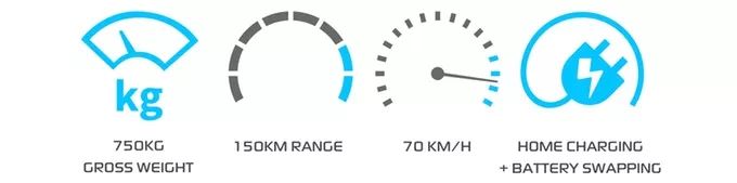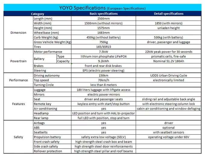 YOYO身长度为2582mm,宽度和高度分别为1500mm和1545mm。车身重量为550公斤,其续航里程数可达150公里。