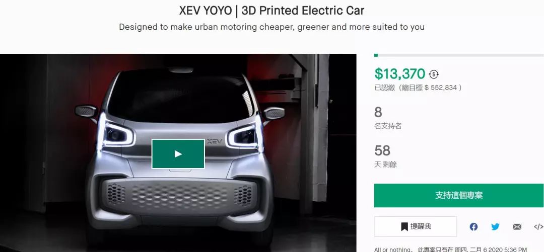 2019年12月9日,全球著名的3D打印汽车XEV公司的首款产品YOYO,以众筹的形式走向市场,基础包定价5999欧元一辆(约合4.6万人民币),拟定于2020年12月发货;众筹目标金额50万欧元。目前,这款车的驾驶设计为右舵,适合欧洲使用;安全性上达到或超过了欧盟“重型四轮摩托车”L7的标准。