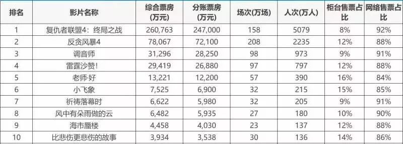 4月全国票房总收入为47亿。《复仇者联盟4》以单片26亿的票房收入,成为当月的票房冠军,对于总票房成绩的贡献率超55%。4月4日上映的港片《反贪风暴4》以7.8亿的票房收入位列第二,对于总体票房的贡献率为16.5%。