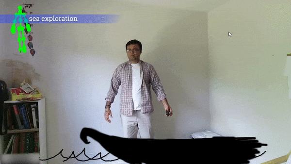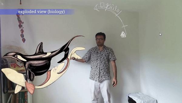 比如老师今天上课的内容是介绍一种海洋生物:鲸鱼。传统的多媒体教学会给学生展示一条鲸鱼在屏幕上,用箭头标注出这些部位分别叫什么。但是利用Saquib他们开发的系统,教师可以在视频中和这条鲸鱼实时互动,通过上下抬臂这个动作“打开”鲸鱼,让同学们看到鲸鱼内部骨架结构、五脏器官构造和外部皮层的关联。