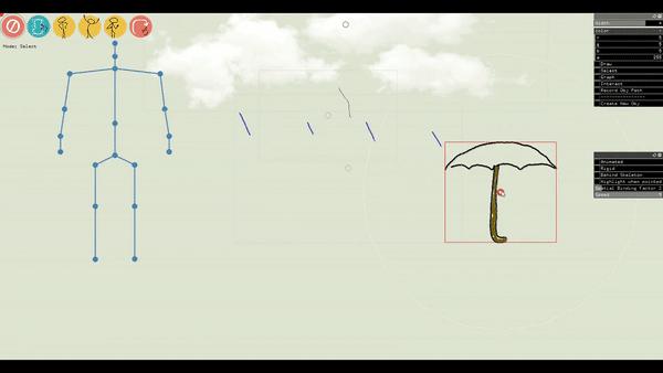 教师在打开系统后,会看到这个人形的大框架。蓝色的“人架子”上,每一个圆点代表着人体可移动关节的19支点,如:头、颈、肩、肘、手、腰、腿部关节等。右边是Saquib用鼠标画出来的一把雨伞,他还向系统导入添加了云和雨滴,用于辅助教学的图像元素。导入的过程就像PPT导入图片一样简单。