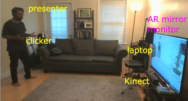 这是一张Saquib在家里使用系统工具的照片。通过画面你可以看到制作的场地不受限制,只需一位讲师、一块屏幕、一台传感器(即图中的Kinect)、一部电脑和一个(手上握着的)点击器就可以开始录制了 。这台电脑的摄像头可以拍到Saquib,电视屏幕相当于一面镜子,S可以通过看屏幕看到自己的表现,并设计自己的互动动作。