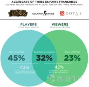 综合分析全球三大顶级电竞项目(《英雄联盟》、《反恐精英》和《DOTA2》)的受众群体,十个取样的西方国家所有玩家和观众中,有23%的人是观看电竞赛事但不玩游戏的。这意味着,所有收看电竞赛事的观众中,42%的人并不玩他们所观看的电竞项目。因此,电竞直播对于平台用户的拉新作用显著。