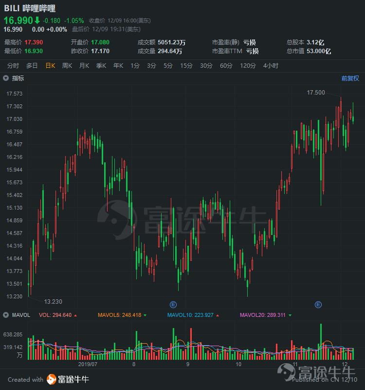 B站股价也在上周二消息刚发出当晚有所下跌,之后在16.50美元徘徊了两天后,周五股价重新回到17美元以上,目前价格为16.99美元。
