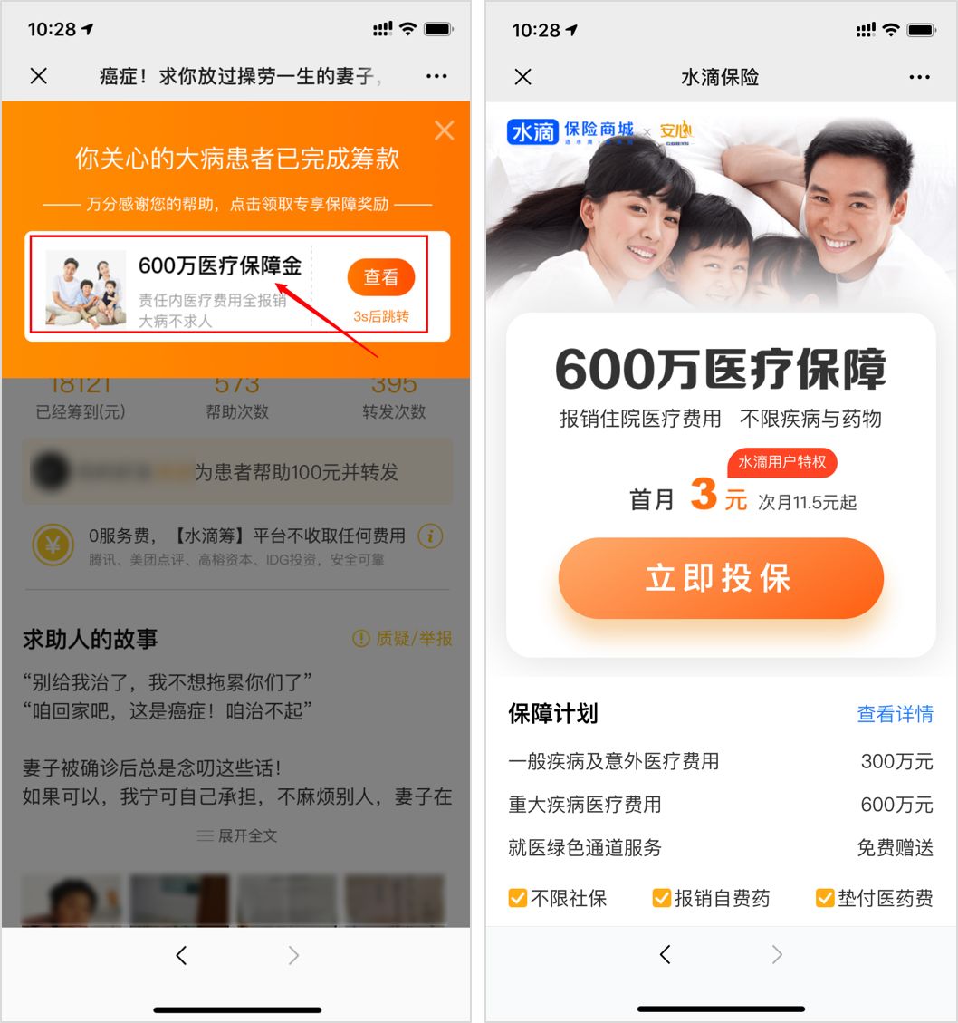 某种意义上说,水滴互助和水滴筹的目的是一样的:获取流量。和水滴筹获取的用户不同的是,水滴互助的用户更精准。在平台的潜移默化下,用户的保险意识和付费意愿都在变强。