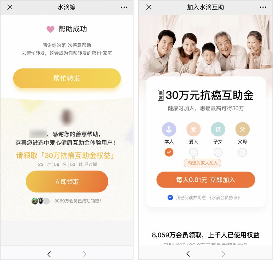 首先,水滴互助一般是通过水滴筹做引流。当我在水滴筹上捐钱成功之后,平台就利用“低门槛”(支付 0.01 元即可加入“互助”)和“高保额”(30 万抗癌互助权益)吸引我加入水滴互助。