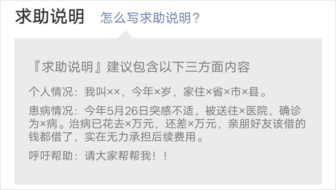 除了标题之外,求助说明也有现成的模板:先是个人情况的介绍,然后介绍病情以及治疗费用的信息,最后在末尾呼唤大家的帮助。也难怪那些求助者故事都看起来如此相似了。