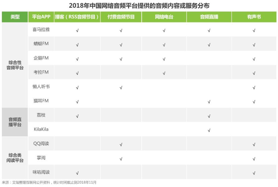 在这个市场上,竞争者并不在少数。艾瑞《2018年中国网络音频行业研究报告》中所统计的在线音频平台达11家,内容包括播客、付费节目、网络电台、直播、有声书等。