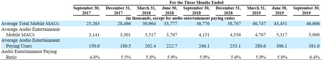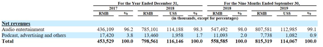 数据显示,音频娱乐产品(虚拟礼品)的营收由2017年的96.2%提升至2018年的98.2%,今年前三季度,占比进一步由98.0%提升至99.1%。至于播客、广告等收入,占比持续下降,今年前三季度更是低至0.9%。