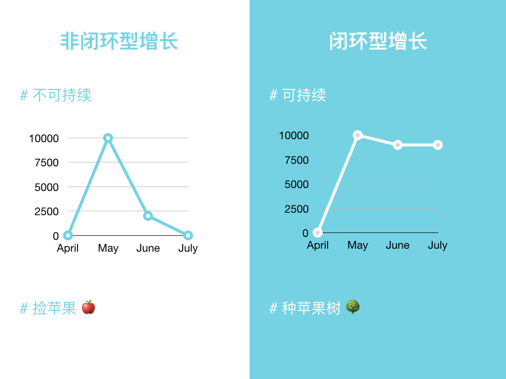 这里就需要提一个我之前总结的核心增长框架—“温和式闭环增长”。闭环增长的关键在于整体思维驱动的顶层设计,特别适用于平台类型的业务。这点和工具不同,工具类型的业务,只需要把工具卖出去即可,边际成本为零,卖的越多越好,并且只需要满足一边的需求,算好账即可。但平台类型的业务,需要构建生态的能力,所以做的所有努力,必须使得生态形成一个完整闭环,各个群体在里面持续地完成任务;反之如果环闭不上,就会导致速起速凉。这就导致,有很多事情我们不能做,比如不能像工具类产品那样,在控制成本的前提下,什么量都要。社交类产品在构建新生态时需要格外注意获取的用户,闭环需要提前想清楚,之后有些量一定不能要,这种取舍短期内会带来成本的提升,但确是用户长期留存的关键。
