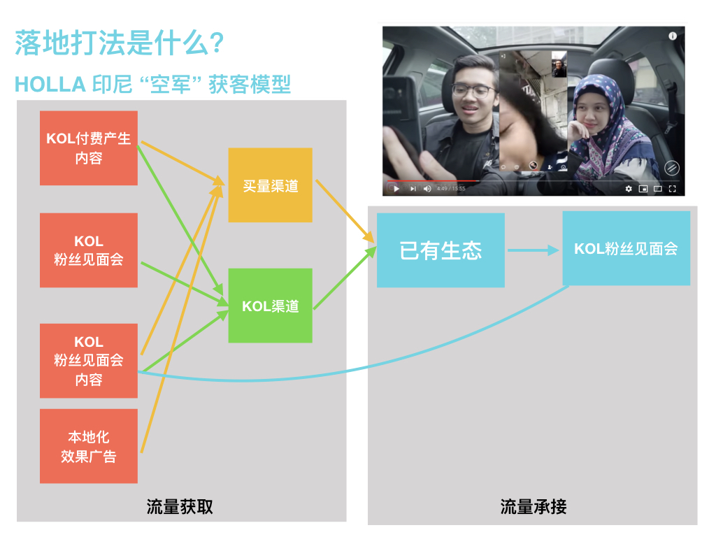 HOLLA APP 是一款针对北美用户的陌生人社交产品,产品形态主要是通过同步视频匹配不同的陌生人,然后建立好友关系,有点类似视频版 Tinder ,主要市场是美国。但在2018年上半年,团队为了达成阶段性目标,在印尼地区打过一场完整的短仗,全球日活提升20%,印尼当地日活增长5倍,一跃成为日活第二大贡献国,在拉新量级迅速增长数倍的过程中,维持了远低于平均值的获客成本。总结了一些有意思的方法论,分享如图。