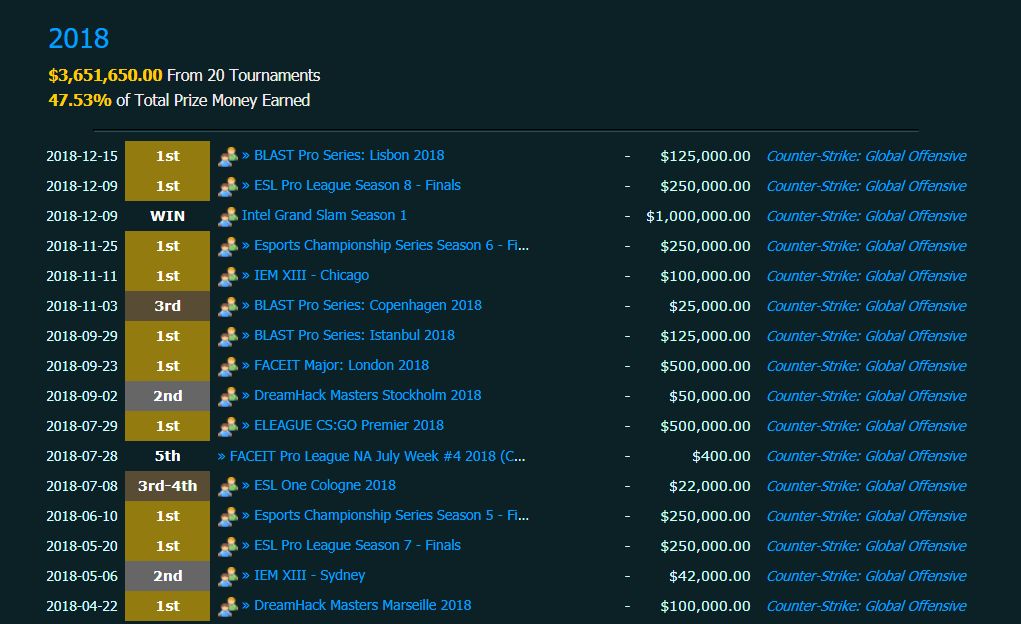 据Esports Earning的数据显示,A队在2018年的总奖金数超过了360万美元,占到了当年度CSGO比赛总奖金池的47.53%。在CSGO选手的个人历史总奖金榜上,前五名被A队包揽。