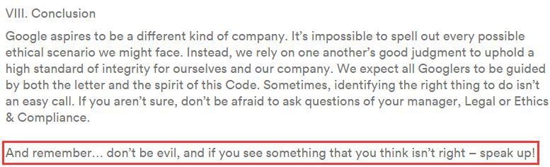 在佩奇重组公司的 2015 年,谷歌的企业价值观已经从「不作恶」调整为「做正确的事情」。在此之后,曾经的灵魂信条「不作恶」便很少出现在在谷歌文化体系中,等到 2018 年 5 月,归档谷歌行为准则时,这句话只在文档的最后,如蜻蜓点水般提了一下,「请记住,不要作恶,如果您发现某些您不认为正确的事,请说出来」。