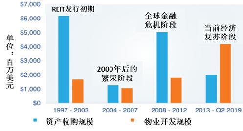 1980年代后期到1990年代初期,权益型REITs管理人开始采取大举收购物业资产的策略。伴随着收购扩张,REITs投资者也把上市的权益型REITs看作类似成长股的资产。