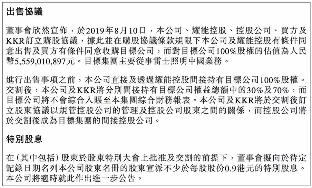 实际上,早在8月11日,KKR与雷士照明控股有限公司就宣布签署股份购买协议。依照协议,KKR将与雷士照明达成战略合作并以约7.94亿美元股权对价收购雷士中国多数股权,雷士照明将获得现金对价。