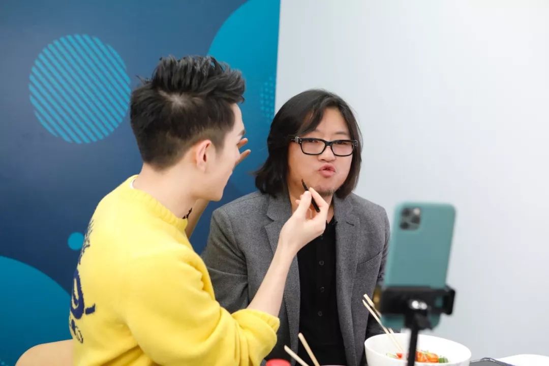 深谙拍照靠后显脸小的道理,他一直坐在李佳琦身后,直到李佳琦说:“老师你这样我会得颈椎病。”他才挪到前排。