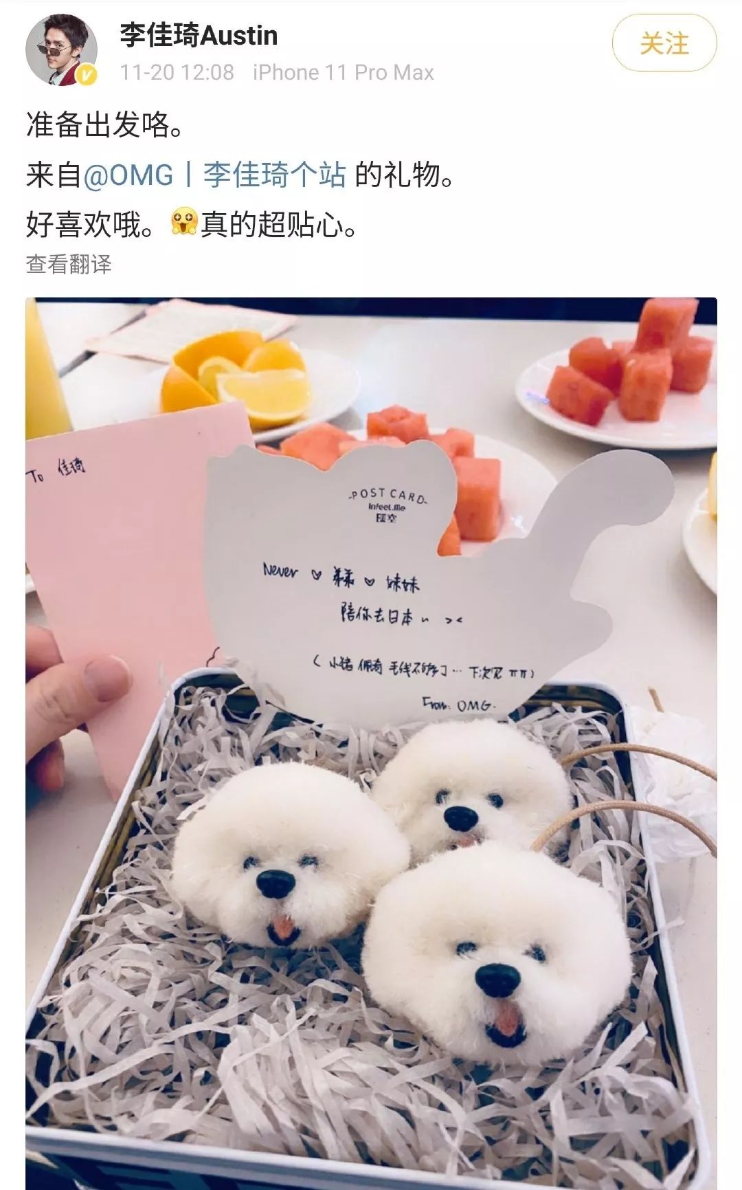 不久前,李佳琦收到了个站站姐送来的羊毛毡,戳了他的狗狗们,对此,他发了微博感谢还将狗狗别在了衣服上。