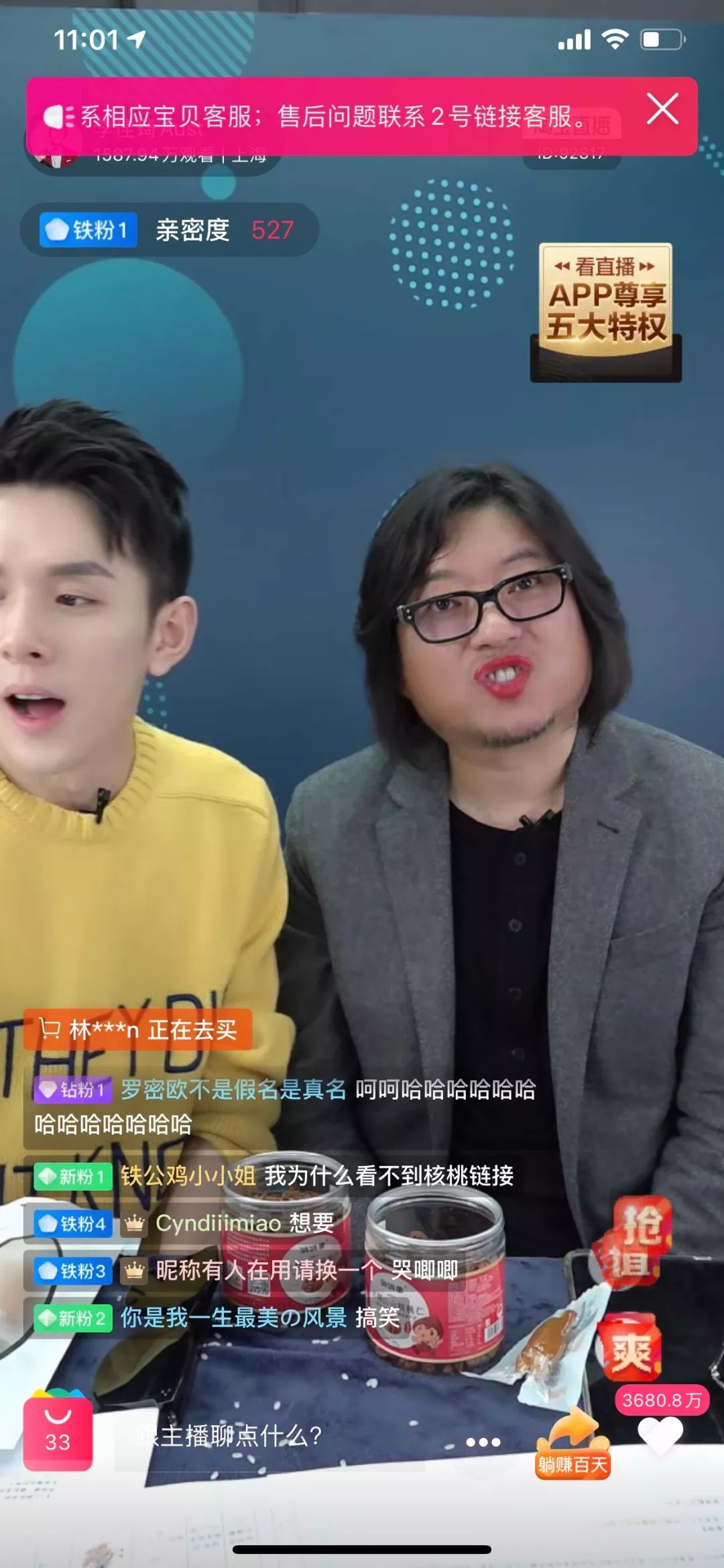 22点27分,第30件商品直播结束后,小助理短暂离开,因为“贵宾来了”。