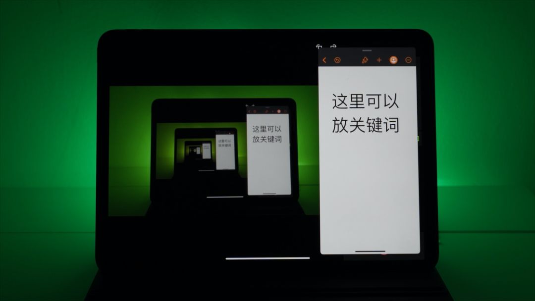 我的相机并没有翻转屏,所以无法监看自己,而 iPad 通过相机配套的软件,就能变成一块监视器。通过分屏功能,可以在另一边放上一些关键词以确保你在视频录制的时候思绪清晰。当然有时候外出拍摄时,有 iCloud 加持的 iWork 套件,可以让 iPad 直接成为我的镜头分镜本,不用打印,更环保。